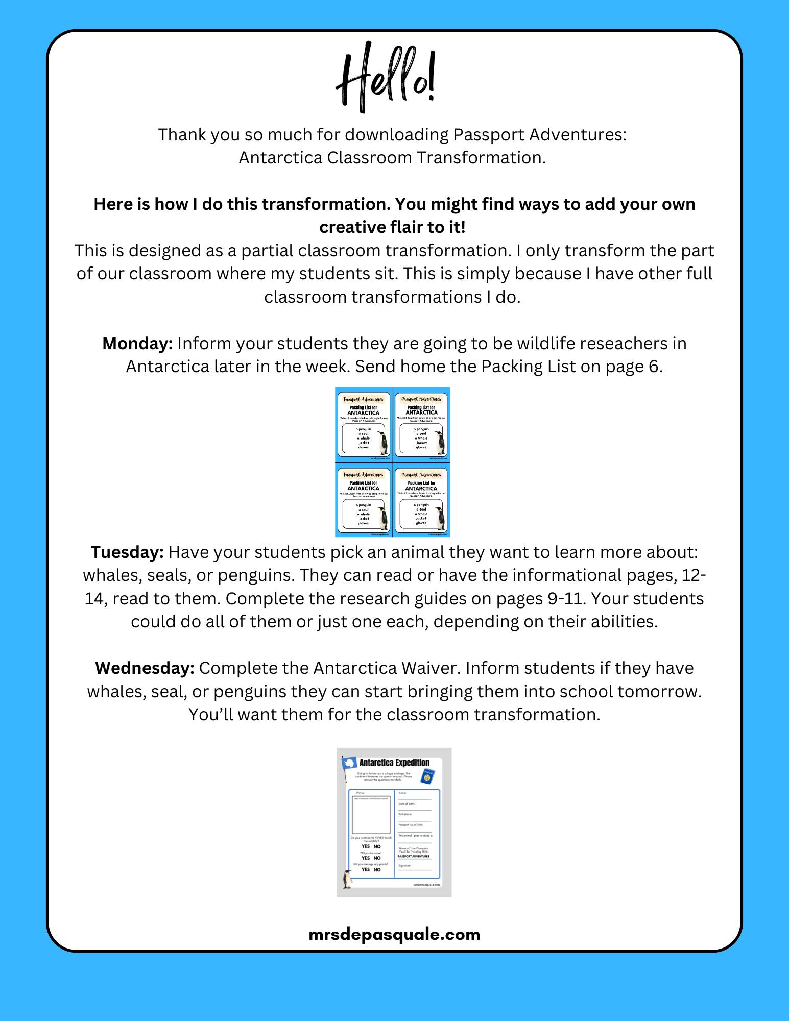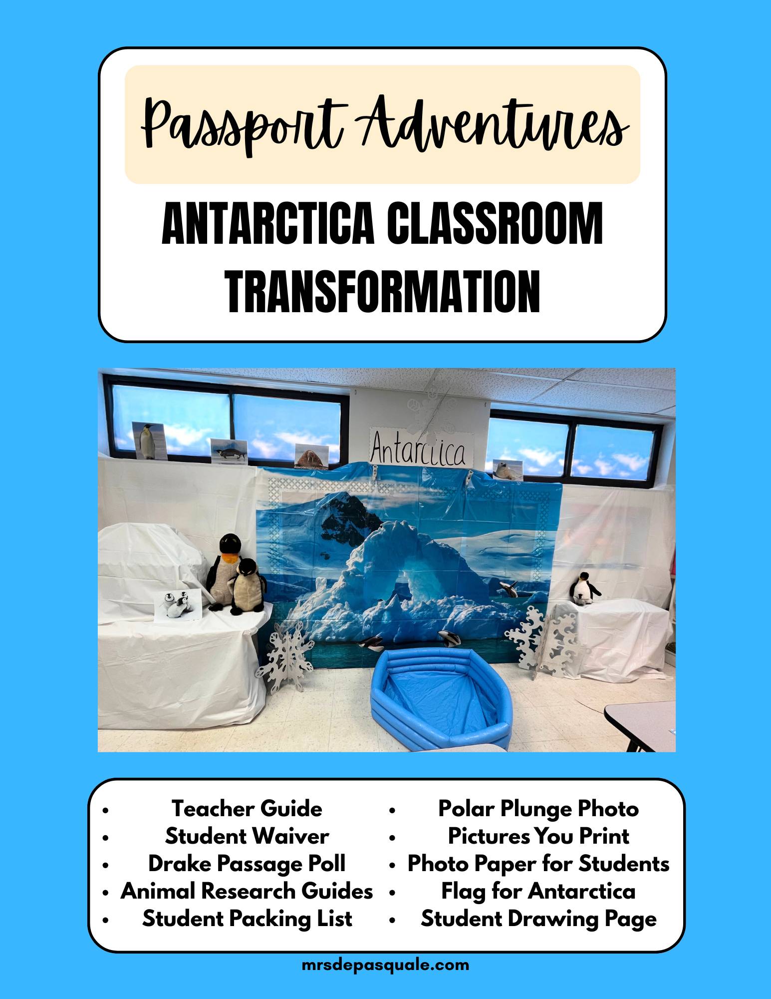 This resource is designed to show you how to transform a space into Antarctica. It comes with pictures of my setup and essentials to make this day come to life for your students.